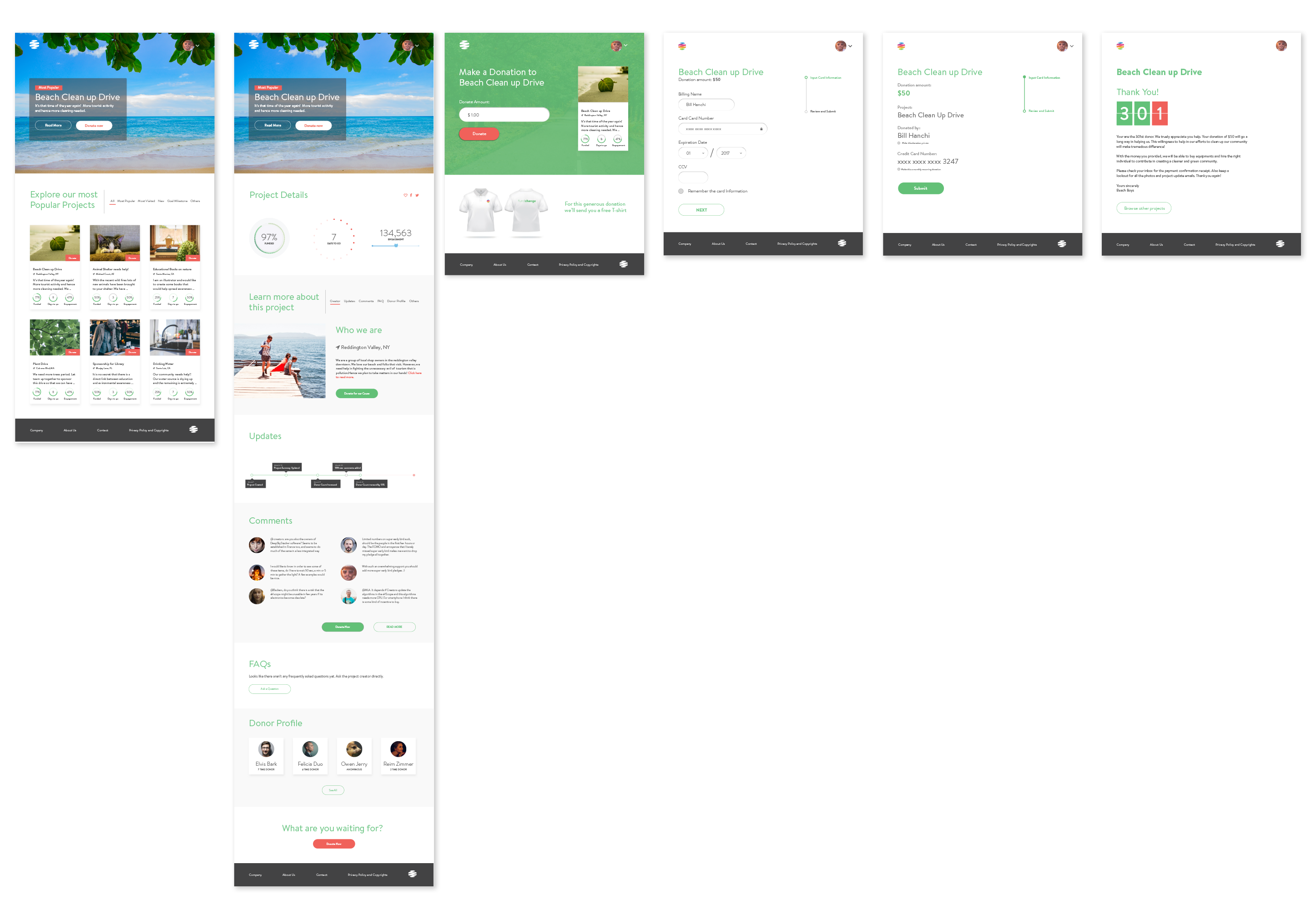 These wireframes trace the journey of donors . Donor's can filter through various projects, read about it, see the progress the project has made so far and choose to make a payment for it.