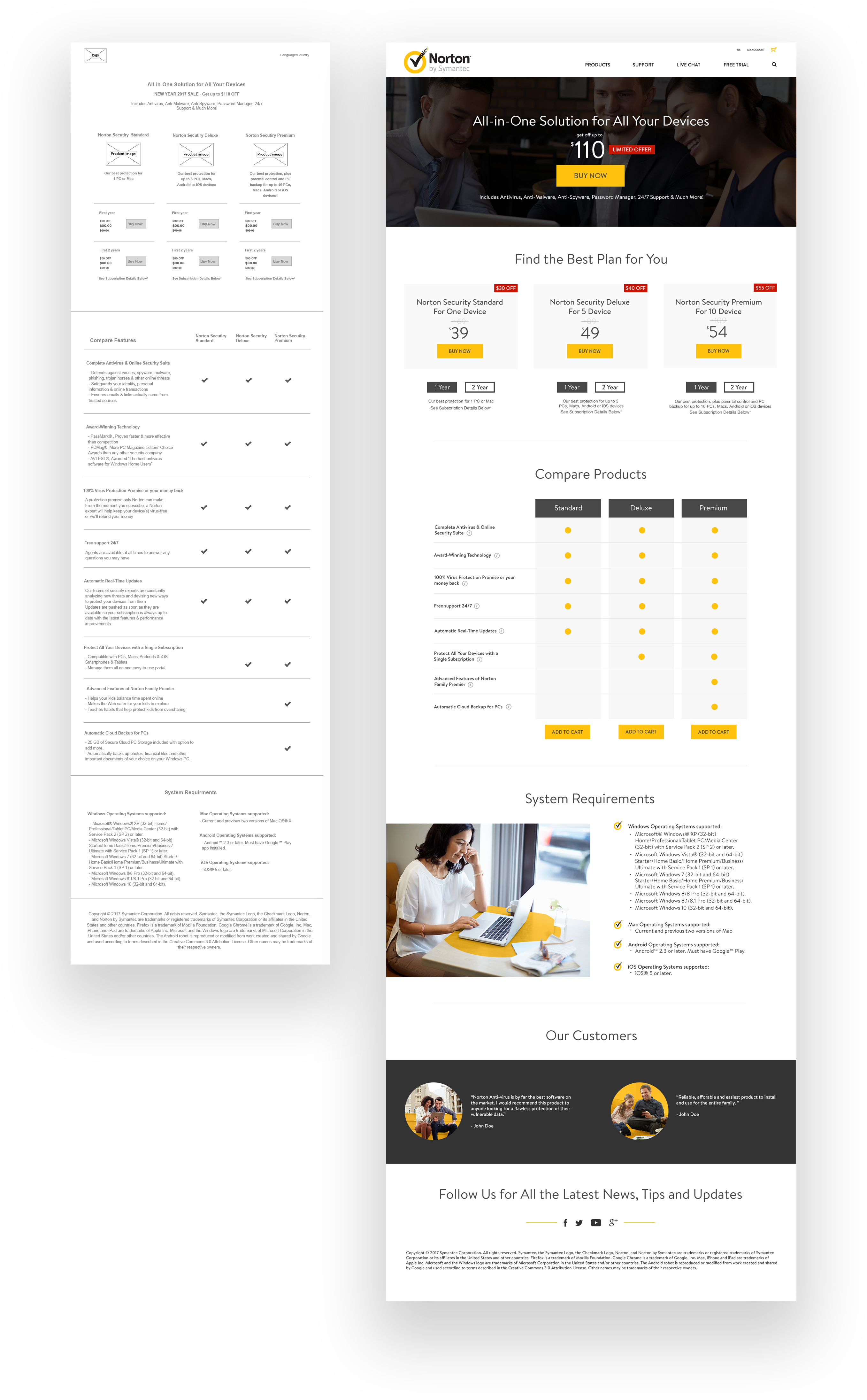 Norton Security launched a new marketing campaign to sell its products through PPC ads. The campaign manager, as a part of an interview process asked me to design a landing page to supports this campaign. To arrive at this page the customers will search for the keywords: “Norton Security” and click on the ad. The purpose of this page is to let the users learn more about the products and make purchase decision.